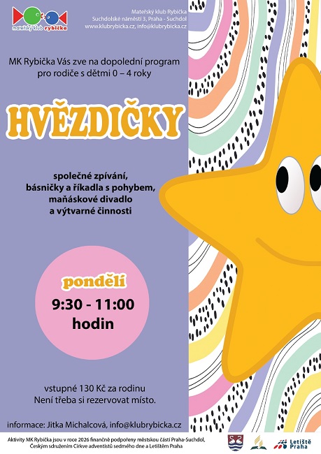 - pondělí Hvězdičky pro rodiče s dětmi 0 - 4 roky, společné zpívání, básničky a říkadla s pohybem, maňáskové divadlo a výtvarné aktivity